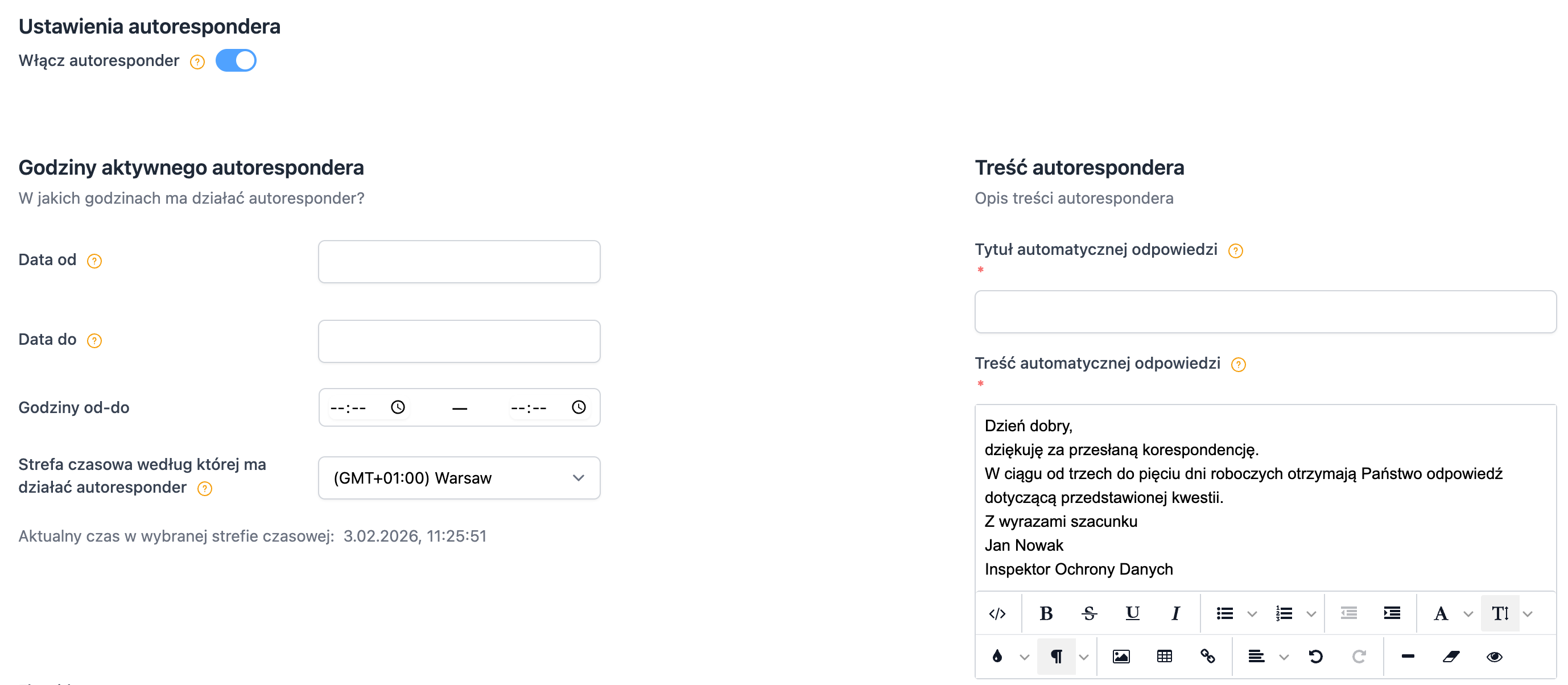 W sekcji “Ustawienia autorespondera” znajdziesz: