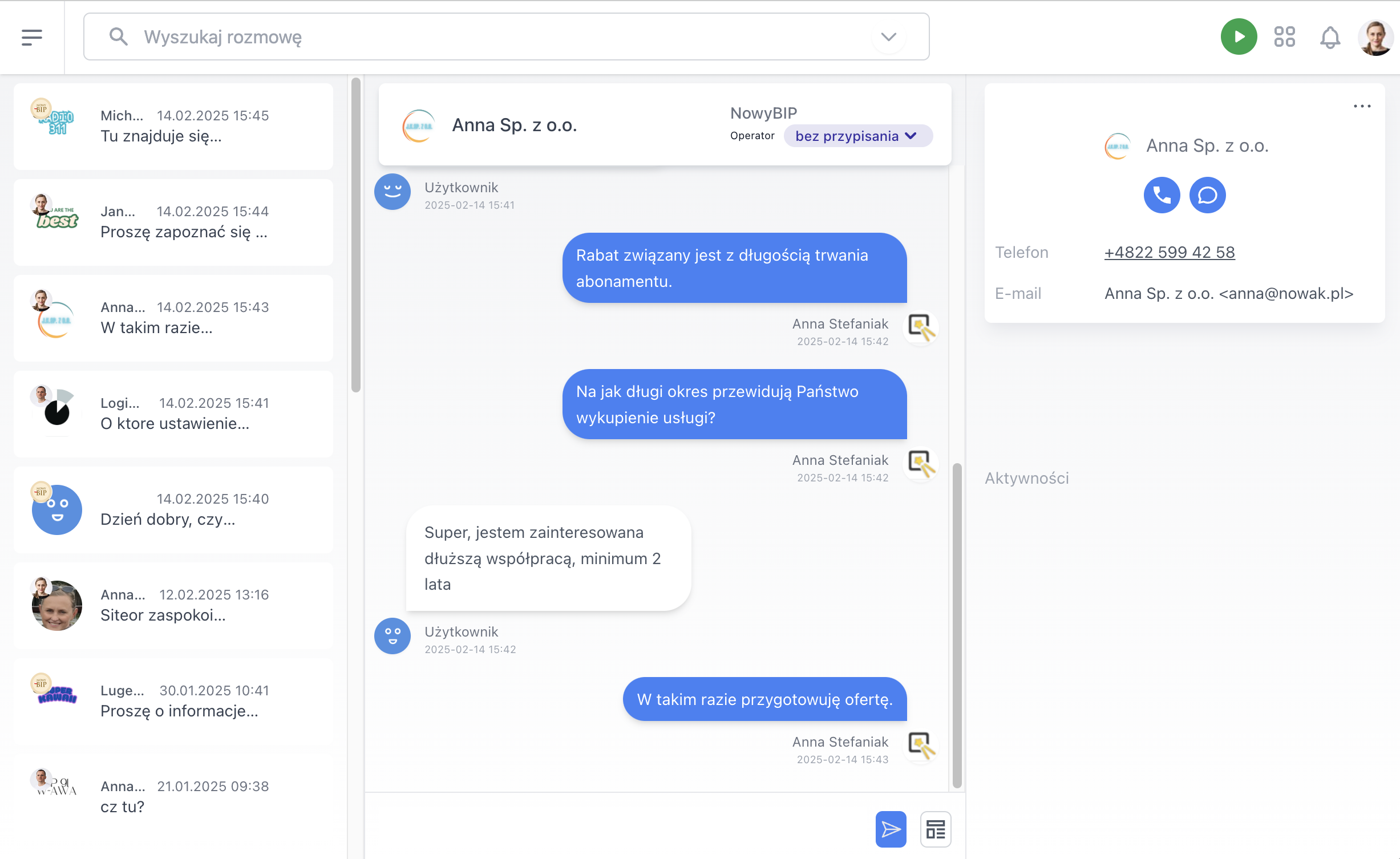 Czat może być obsługiwany przez cały zespół lub wybranych operatorów. Rozmowy są przypisywane do odpowiednich użytkowników, co zwiększa efektywność obsługi i pozwala na lepsze zarządzanie czasem zespołu.