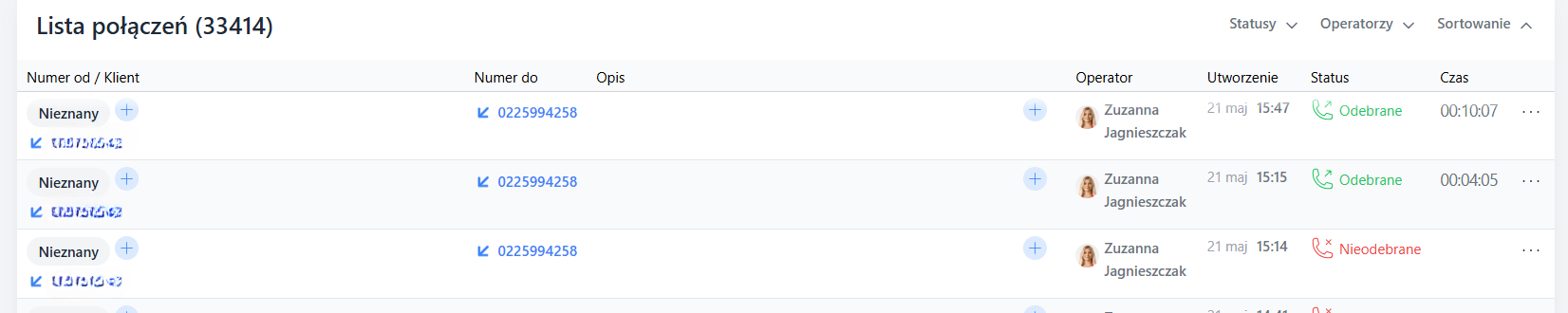 -Status - informuje o statusie połączenia (np. “Odebrane”, “Nieodebrane”, “Zajęte”, “Anulowane”).