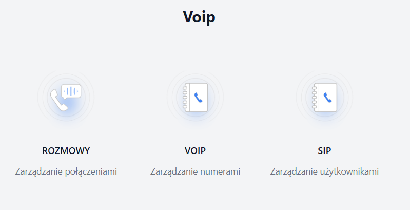 Dashboard modułu VoIP prezentuje trzy główne sekcje, każda dedykowana osobnemu obszarowi zarządzania usługami VoIP