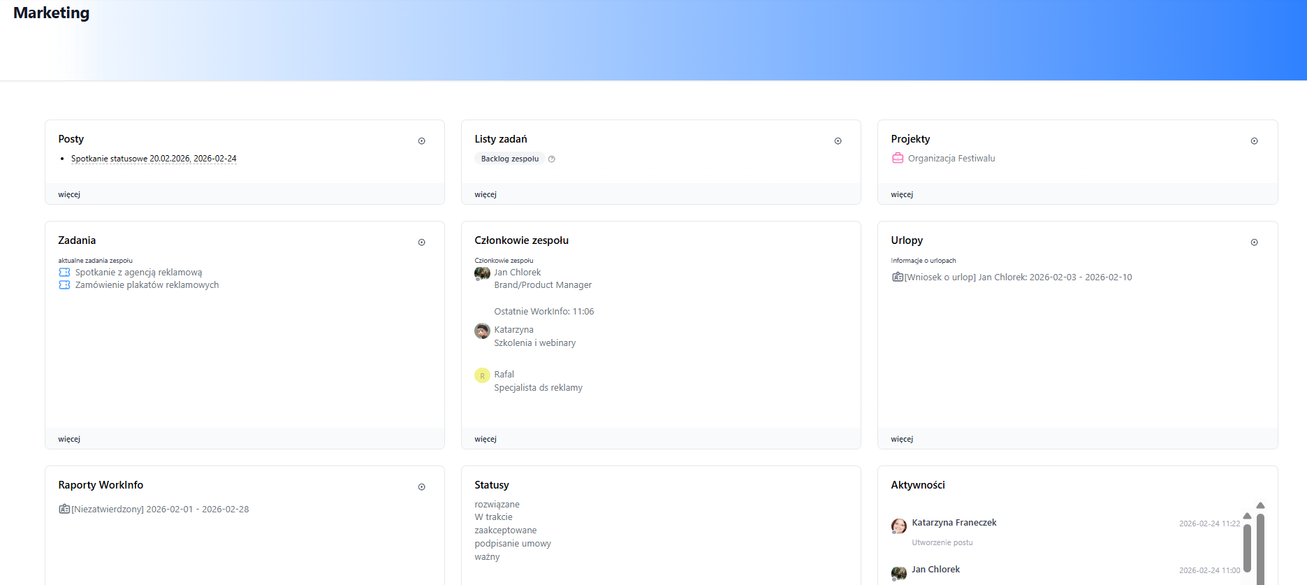 Zespoły w module Organizacja pozwalają organizować użytkowników w grupy robocze. Każdy zespół ma własną tablicę i statusy zadań.